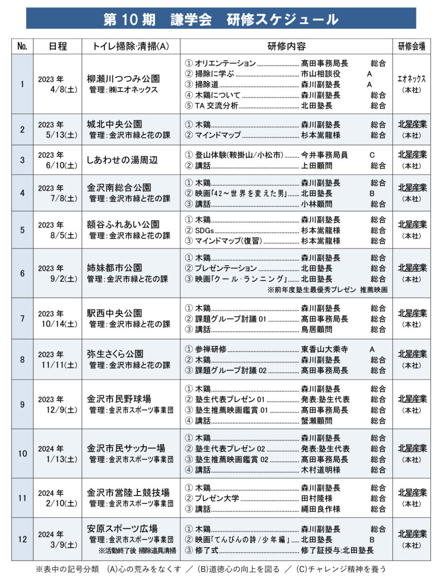 「社会的知識や基本的なマナーを身につけ、企業の持続的成長の一翼を担う人材を育成する」を掲げ、謙虚さと集団再建三原則*を学ぶ「謙学会」が10周年を迎えた。