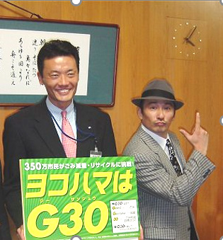 2003年1月、行動宣言を発しました。「横浜はG30」 3年にわたる徹底した大キャンペーンの始まりです。“横浜のような大都市で市民にゴミの分別をしてもらうことは無理”という諦めは、分別の方法を伝えられないから、という理由でした。そこで時間と予算を十分確保して、3年にわたって伝えることだけに徹したのです。
