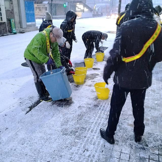 1時間山形駅~繁華街などの雪が積もっていないところのゴミ拾いや、通路のガム取りをおこないました。終了後、親切な会員が水道凍結のためにポリバケツに持参したお湯で道具洗いをおこないました。